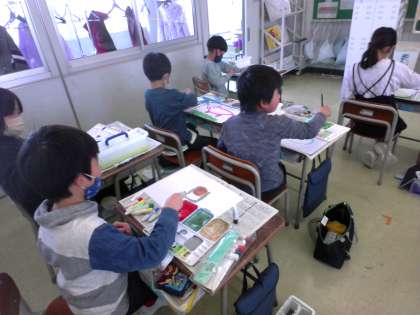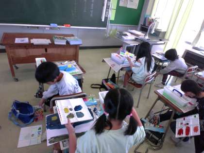 図画工作科の学習で、水彩絵の具を使い作品を描いています。色を合わせることの面白さを感じながら進めることができています。