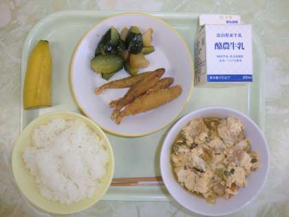 4月17日の給食 公開日 2023/04/17 更新日 2023/04/17 メール用カテゴリ 今日の給食は ごはん ぎゅうにゅう わかさぎのフリッター かふうあえ あつあげのにしきとじ バナナ です。 今日もおいしくいただきました。