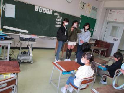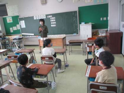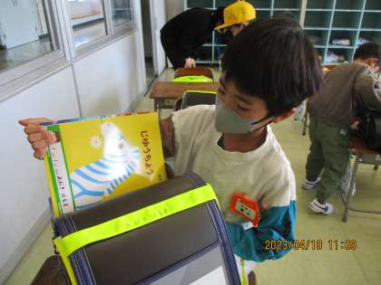 登校してきた子供たちは「おはようございます」と元気な声で教室に入り、朝の支度を始めます。黒板に掲示してある手順カードを見ながら、ランドセル、上着、安全帽、連絡帳、提出物、水筒の順に持ち物を自分で整理しなくてはいけません。自分でできるように、6年生が時々声をかけながら、自分でできるようになるのを見守ってくれています。1週間たった今では、時間が余るほどとても早くできるようになりました。早くできた日には、じゃんけんゲームやなぞなぞ等、楽しいごほうびが6年生からもらえます。