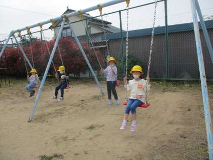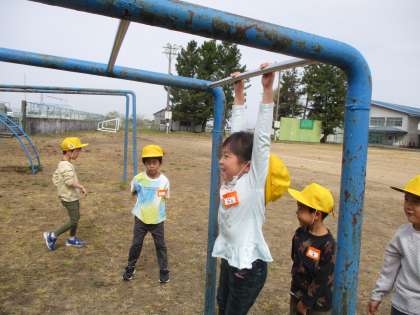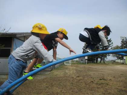 道徳科の時間に、みんなで仲よく遊ぶにはどうしたらよいかということについて話し合いました。順番を守ることや、声をかけて誘うこと、交代で道具を使うなど、いろいろな意見が出ました。その後、グラウンドに出て、みんなで仲よく遊具を使って遊びました。