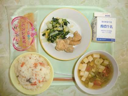 4月21日の給食 公開日 2023/04/21 更新日 2023/04/21 メール用カテゴリ 今日の給食は、入学お祝い献立です。 ちらしずし ぎゅうにゅう とりにくのからあげ おひたし すましじる おいわいデザート です。 今日もおいしくいただきました。