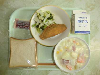 4月25日の給食 公開日 2023/04/25 更新日 2023/04/25 メール用カテゴリ 今日の給食は、 しょくパン ぎゅうにゅう サーモンフライ ブロッコリーサラダ クリームチャウダー メープルジャム です。 今日はG7献立、カナダの日でした。おいしくいただきました。