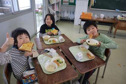今日の給食では、グループにしてみんなで食べました。話すときも小さな声ですが、いつもよりおいしく感じたと子供たちは喜んでいました。