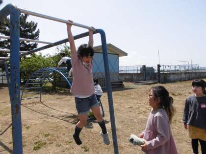 休み時間には元気に遊ぶ草島っ子。今日は昼休みに約三分の一の子供たちがグラウンドに出て遊んでいました。1年生と上級生が遊んだり、雲底にチャレンジしたりして、子供たちは思い思いの遊びを楽しみました。