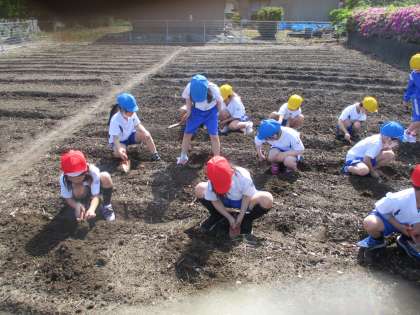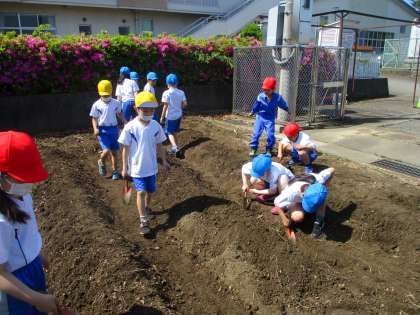 生活科「おいしい野菜大さくせん」では、夏野菜を育てます。学校農園の畝作りから始めました。