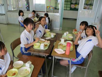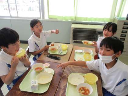 今日から机をくっつけての会食を行いました。楽しそうに友達と話しながら給食を食べていました。
