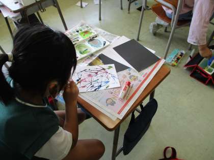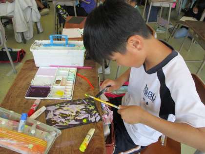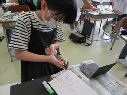 今日はふき流し、スパッタリング等、様々な技法を使って、絵を描きました。自分の予想とは違う色の出方をすることもあるので、楽しんで活動していました。