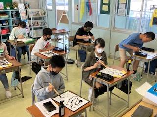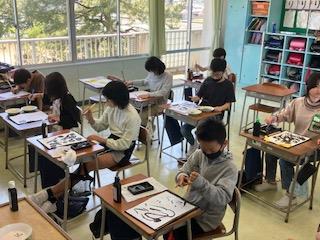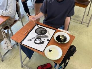 6年 図画工作科「墨と水から広がる世界」 公開日 2023/05/16 更新日 2023/05/16 6年生 普段、書写で使う墨を使って水墨画の世界を体験しました。 筆の使い方だけでなく,水の量を変えて様々な表現の仕方を考え表しました。 濃さの調節の難しさを感じながら進めていました。