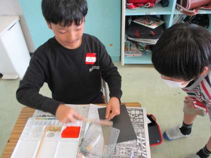 うすめにといた絵の部をストローで吹いたり、歯ブラシと網をこするって模様をつけたりしました。