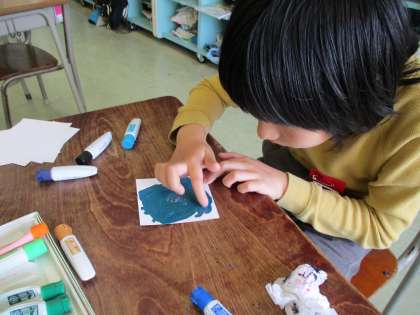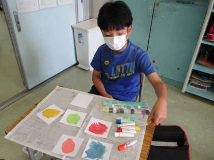 図工「色合い ひびきあい」の学習では、2色以上の色を指で混ぜてできる色づくりや触感を楽しみました。