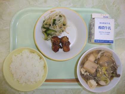 6月2日の給食 公開日 2023/06/02 更新日 2023/06/02 メール用カテゴリ 今日の給食は、 ごはん ぎゅうにゅう ちくわのなんぶあげ あまずあえ すきやき です。 今日もおいしくいただきました。