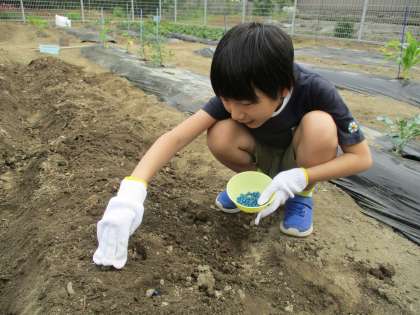 今日は、畑の畝作りをしてから、ダイズを植えました。