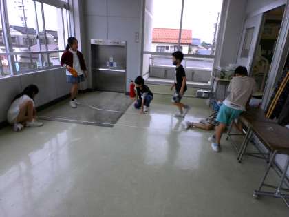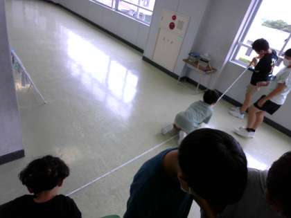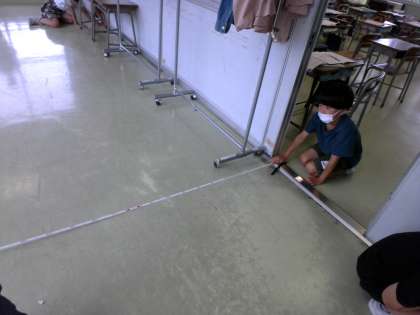 今日の算数の学習では、巻き尺を使って廊下の長さをはかりました。次はより長いものをはかっていきます。