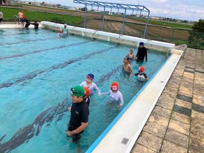 6年生 プール開きを終え、初泳ぎをしました。 公開日 2023/06/23 更新日 2023/06/23 6年生 自分たちで清掃したプールにいよいよ入る日です。 今日は、学校のプールに入るのが初めての1年生と一緒にプールに入りました。 6年生として、今年の目当てを決めてこれからの学習をしたいという思いを高めました。