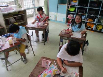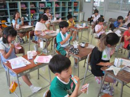 養護教諭に「6歳臼歯」の大切さと歯の磨き方を教えてもらいました。その後、鏡を見ながら、色で染まった歯がをきれいになるように磨いていました。