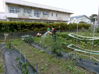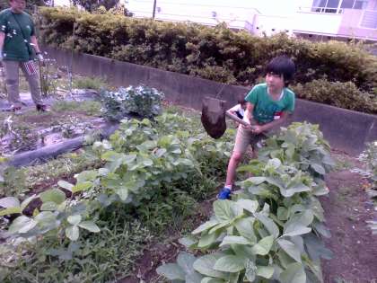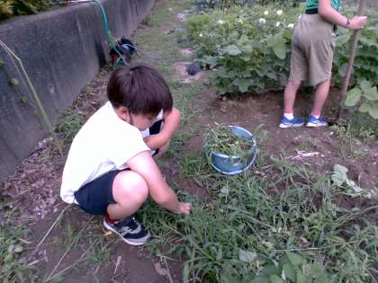 今日は、大豆の土寄せと水やり、草むしりなど、野菜のお世話をしました。