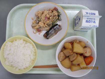 7月12日の給食 公開日 2023/07/12 更新日 2023/07/12 メール用カテゴリ 今日の給食は ごはん ぎゅうにゅう さんまのしょうがあじ ベーコンとゴーヤのたまごいため たきあわせ です。 今日もおいしくいただきました。