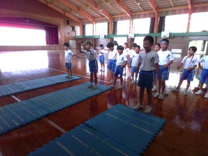 今日の体育では、体力テストの立ち幅跳びを行いました。記録が伸びるよう、手のふりを大きくする練習をしていました。