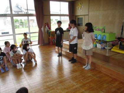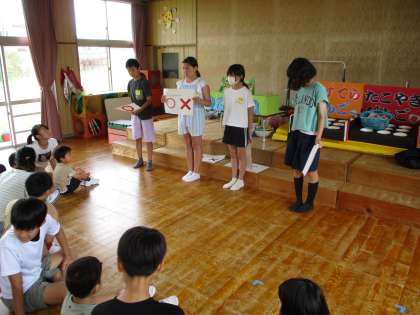 5年生 総合的な学習の時間「双葉保育所の園児と交流しよう」 公開日 2023/07/19 更新日 2023/07/19 5年生 総合的な学習の時間の学習活動として、双葉保育所と交流しました。自己紹介を交えたゲームや学校のことを紹介する〇×クイズを企画しました。園児から「楽しかった」という感想が聞かれて嬉しそうな子供たちでした。