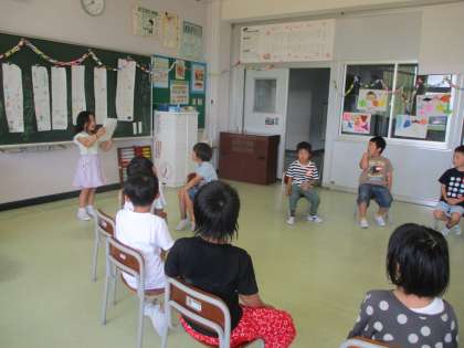 今日は集会当日。みんなで飾り付けをした後、椅子取りゲームや爆弾ゲーム、フルーツバスケット、じゃんけん汽車ぽっぽ等、たくさんのゲームをしました。また、集会の終わりにはみんなで校歌を歌いました。しばらく会えなくなるのはさみしいけれど、2学期もまたみんなと仲良くがんばります。