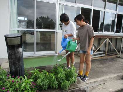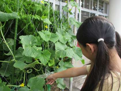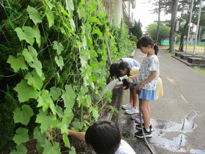 朝の自主活動の時間に水やりや草むしりを行っています。グリーンカーテンも成長して、1年教室まで伸びてきています。きゅうりやゴーヤも少しずつ収穫できるようになってきました。