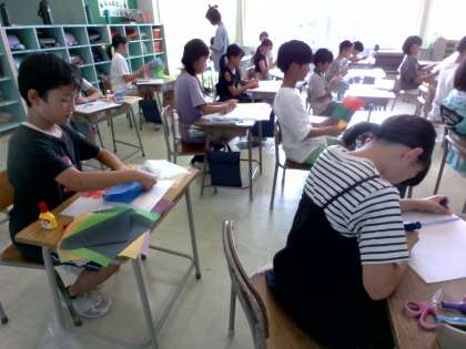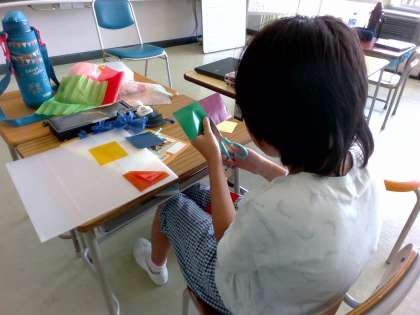 いろいろな材料や色の組み合わせて、製作しています。光にかざしながら、貼り方を考え