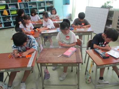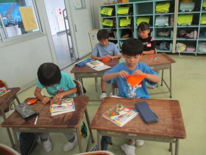 もうすぐ来年入学する新しい1年生が健康診断にやって来ます。そこで、学校のことを紹介する手紙やプレゼントをあげようということになりました。プレゼントは花のたねの他に、折り紙で作った飾りをあげることにしました。