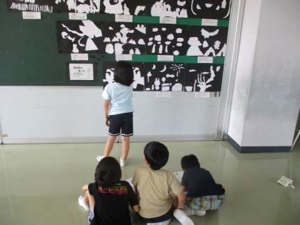 「この形、おもしろいね」「どうぶつがいるね」と話しながら、友達の作品を鑑賞しました。