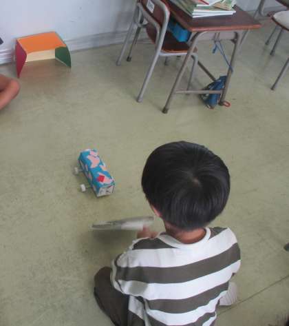 自分で作ったおもちゃの遊び方を考えて試したり、友達のおもちゃで遊んだりしています。