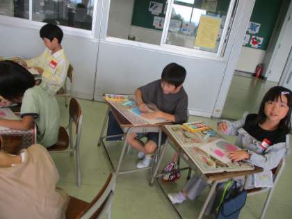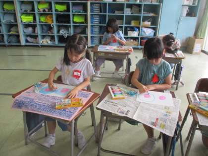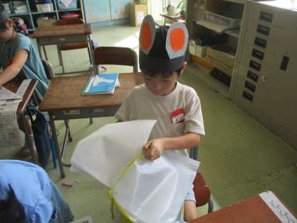 学習発表会で発表する「できるようになったよ おむすびころりん」では、全員がねずみに扮して、入学以降、学習を通してできるようになったことを発表します。今日はねずみの耳を作りました。好きな色を選び、耳の中の部分も自分で形を決めました。自分の耳ができあがると、気分も高まってきました。連絡帳を書くときにも耳を付けるくらい、みんなは自分の耳が気に入ったようです。