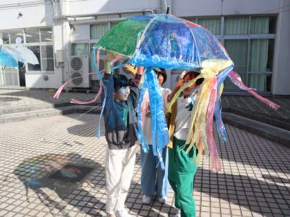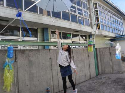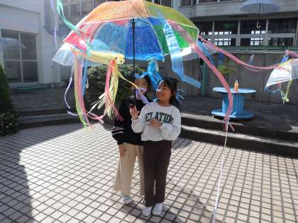 中庭に飾られている5年生の図工作品が最近のお気に入りです。「傘を飛ばされた人」と自分で題名を付けている子や、これがお気に入りの傘と言って楽しそうにしています。よりきれいな中庭にするために掃除をし始めている子もいました。