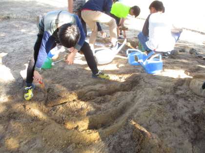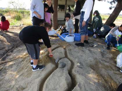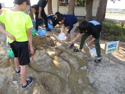 5年生 理科「流れる水のはたらき」実験中です 公開日 2023/10/27 更新日 2023/10/27 5年生 流れる水がもつはたらきを調査しようとモデル実験に取り組んでいます。流れる水によって、斜面が削れていく様子や水によって小石が流されていく様子等を観察し、はたらきの理解を深めています。