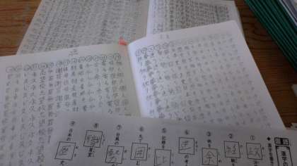 テストが始まるとピリッとした緊張感ある雰囲気に一転し、問題用紙に向かい合う子供の姿が見られました。2枚目の写真は、苦手だから頑張りたいと努力を重ねてきた子供たちのノートや練習プリントです。努力の過程にも目を向け、「成長」を促せるようにしたいと思います。