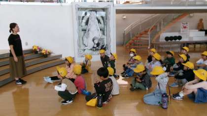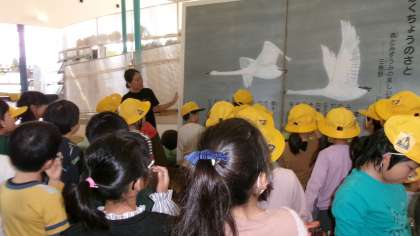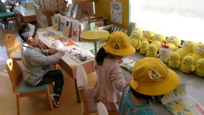 2年生と一緒に、大島絵本館に行きました。大きなバスに乗るというだけでわくわくしてきます。船をイメージした建物もとてもすてきで、ますます期待が膨らみます。絵本の原画展を見た後、大きなシアターでお話のビデオを視聴しました。動物たちが出てくるお話、おもしろい男の子が出てくるお話に子供たちは引き込まれていました。その後は、10000冊もの蔵書を誇る閲覧室でいろいろな絵本を読みました。大きな絵本、動く絵本、しかけ絵本等、見たこともないような絵本に子供たちは目を丸くしていました。