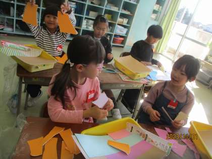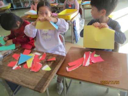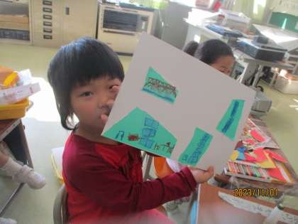 1年生 図画工作科の学習「やぶいたかみの かたちから」 公開日 2023/11/14 更新日 2023/11/14 1年生 はさみを使わずに紙を手で破り、できた形をじっと見つめます。すると、何かの形に見えてきます。できた形をくるくると回転させながら考え込む子、できた形にクレヨンで描き加える子、紙を重ねて貼り付ける子、どの子も楽しそうに自分の感じた世界を表していました。