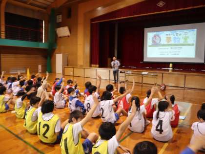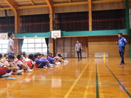 カターレ富山夢教室に3・4年生が参加しました。カターレ富山から大山武蔵選手が来てくださいました。夢に向かってがんばるコツなどの講演を聞きました。また、実際にプロの選手とサッカーをしてプロのすごさを感じることができました。