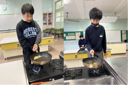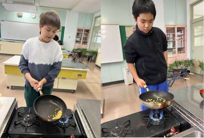 11月30日(木) 大豆を煎りました。 公開日 2023/11/30 更新日 2023/11/30 かがやき級 畑で育てた大豆を収穫してフライパンでいりました。 子供たちはフライパンの上をコロコロと転がしながら楽しく煎っていました。 煎った後は塩をふって美味しくいただきました。
