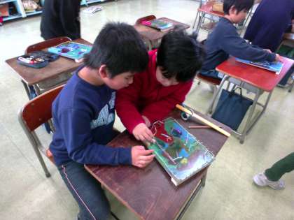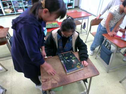 図画工作科の学習でくぎうちゲームを作りました。絵を描き、釘をうつなどたくさんの作業をしようやく完成しました。みんなであそびながら、お互いのゲームについて話していました。