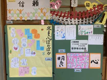 人権週間の取組 公開日 2023/12/18 更新日 2023/12/18 メール用カテゴリ 人権週間に、人権について考える取組を行っています。児童玄関前には、各学年で話し合ったり活動したりした取組の様子を掲示しています。これからも、互いのよさを認め合える、温かい草島っ子でいてほしいです。