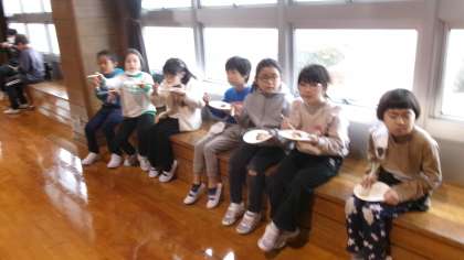 PTA主催のもちつき大会がありました。杵で餅をつく体験をし、つきたての餅を食べました。たくさんの子供たちが「おいしい」「もっと食べたい」と言っていました。