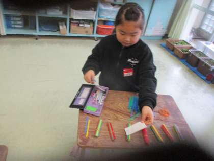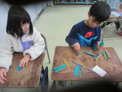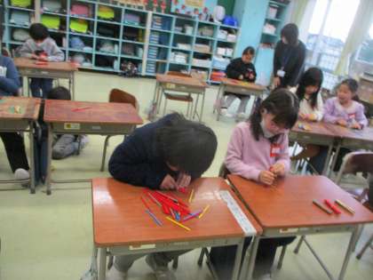 1年生 算数科の学習 公開日 2024/01/12 更新日 2024/01/12 1年生 今日は数え棒の数を数えました。長細い数え棒を「10の束」にまとめて何本とれたかを数え、ペアの友達と数の大きさを比べました。棒の数の大きさを比べるには、10の束に目を付けて比べればよいということがすぐに分かりました。学習の終わり頃には、数え棒の実物が無くても、数字を見ただけで「10の位だけ見ればすぐに分かるよ」と、どの子も正解することができるようになりました。