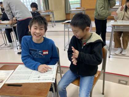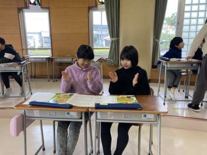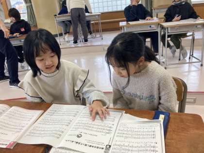 友達と一緒に楽譜を見ながら、楽しく手拍子しています。