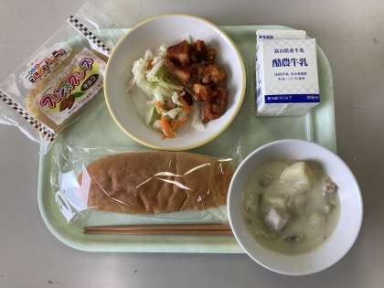給食週間2日目。今日は「フランス献立」でした。オリンピック開催国フランスの料理を取り入れた献立でした。フリカッセとはどんな料理でしたか?草島っこの皆さん、お家の人に献立の説明をしてあげてくださいね♪