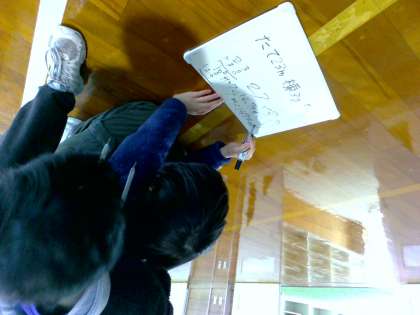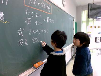子供たちは、「1ha(ヘクタール)は絶対ないな。どれくらいかな〜。」と予測しながら、実際に体育館の縦と横の長さを協力して測定し、計算をして求めました。