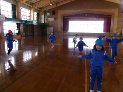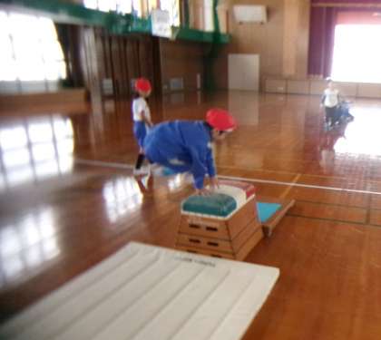 今、体育では、縄跳びと跳び箱遊びをしています。縄跳びは、練習するたびに少しずつ跳ぶ数が増え、速く跳べるようになりました。跳び箱遊びでは、しっかり手をついて跳ぶ練習をしたり、横跳びをしたりしています。