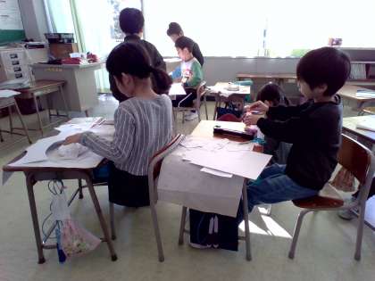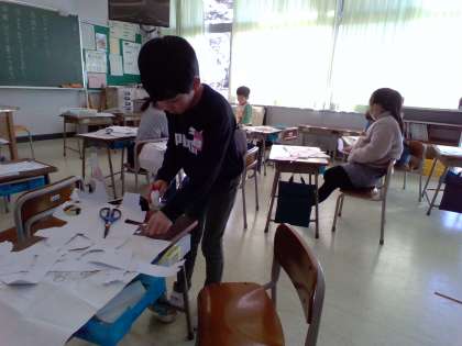 版画に向けて、画用紙で下絵を作りました。顔のパーツの細かいところまで作っていたり、ポーズに悩んでいたり、考えながら画用紙を切ったり貼ったりしました。