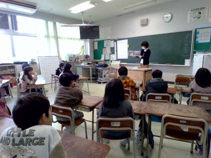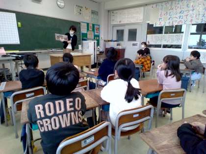 市立図書館四方分館の方が来校され、読み聞かせをしてくださいました。5冊ほど読んでもらい、その本をひと月貸すと言ってくださいました。子供たちは、真剣に聞き、読み聞かせが終わると、「続きが気になるー!」と言ったり、周りの友達と感想を言い合ったりしていました。