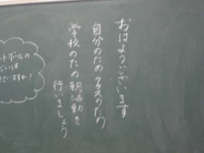 朝の自主活動 公開日 2024/02/05 更新日 2024/02/05 メール用カテゴリ 4年生は、朝の自主活動で階段の汚れを取っている子供たちがたくさんいました。4年教室には、自分や学校のために取り組もうという担任のメッセージが書かれていました。4年生の思いが伝わります。