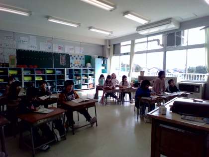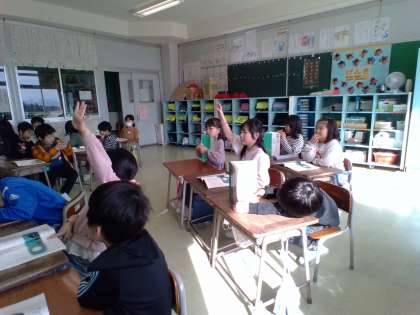 「たぬきの糸車」のお話を学習しています。「キークルクルってなんの音?」という担任の問いかけにたくさんの子供たちが手を挙げて答えようとしていました。「糸を紡ぐ音です。」「つむぐってどういうこと?みんな分かる?」…話合いが楽しく続いていました。