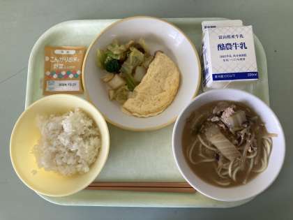 2月15日の給食 公開日 2024/02/16 更新日 2024/02/16 メール用カテゴリ 今日の給食は ごはん ぎゅうにゅう オムレツ ビーンズサラダ とんこつラーメン やさいふりかけ です。 今日もおいしくいただきました。